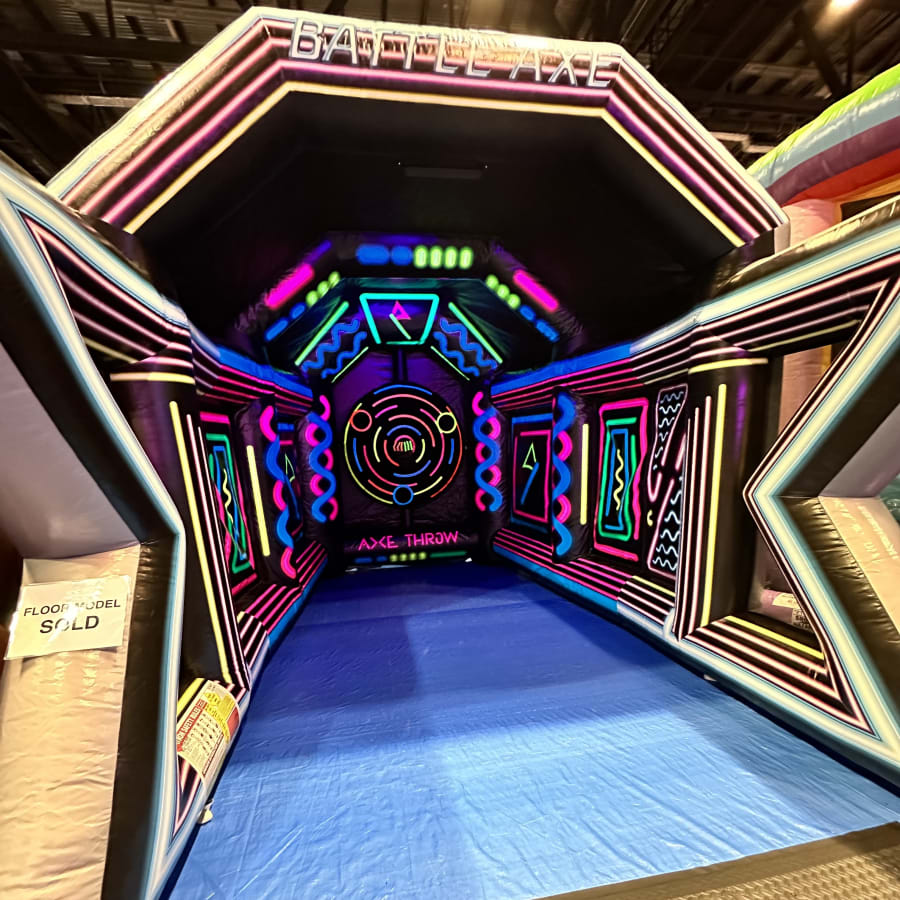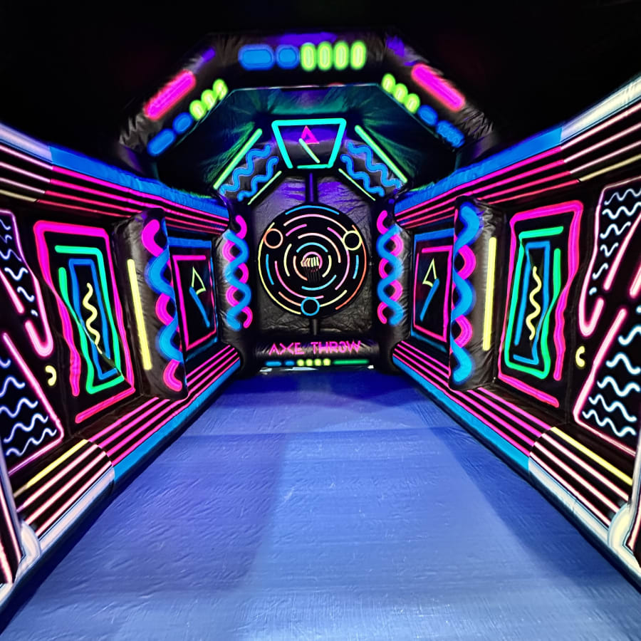 Looking for a unique and thrilling activity to take your event to the next level? Look no further than our Inflatable Axe Throwing experience! Perfect for both indoor and outdoor events in Orillia, Simcoe County, this glow-in-the-dark 10x20 inflatable set will keep your guests entertained for hours.